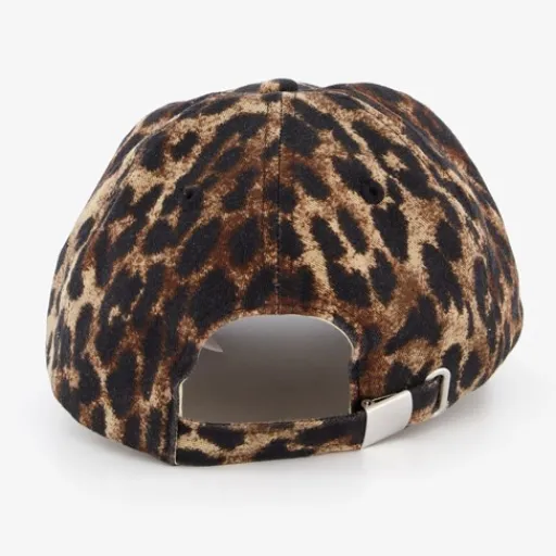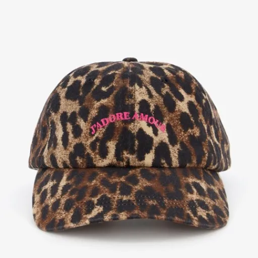 Bruine pet met panterprint en roze tekstopdruk voor dames. Voorzien van een verstelbaar bandje aan de achterzijde en gemaakt van katoen.
