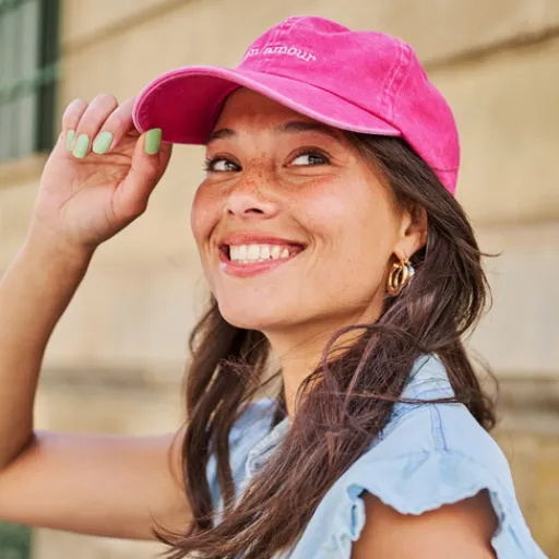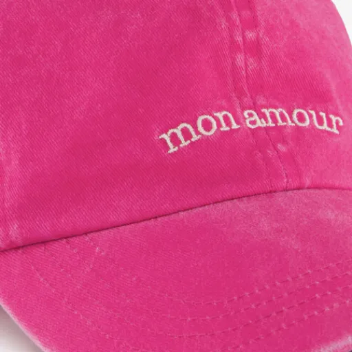Roze pet met witte tekstopdruk voor dames. Voorzien van een verstelbaar bandje aan de achterkant en gemaakt van katoen.
