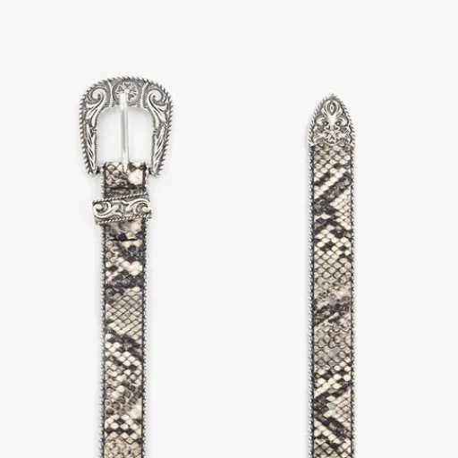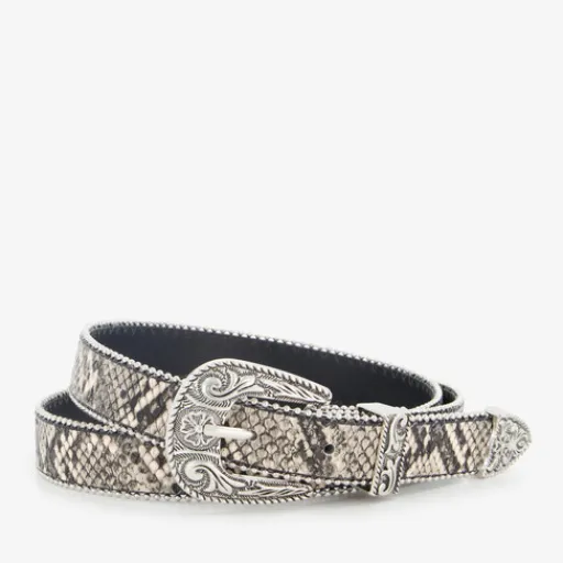 Grijze riem met slangenprint voor dames. De riem heeft een zilverkleurige gesp en zilverkleurige details. Gemaakt van imitatieleer.
