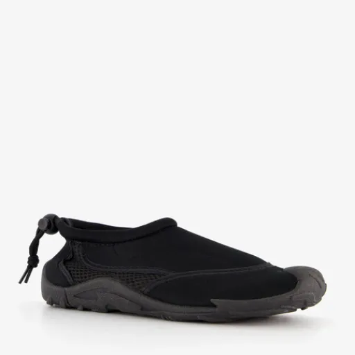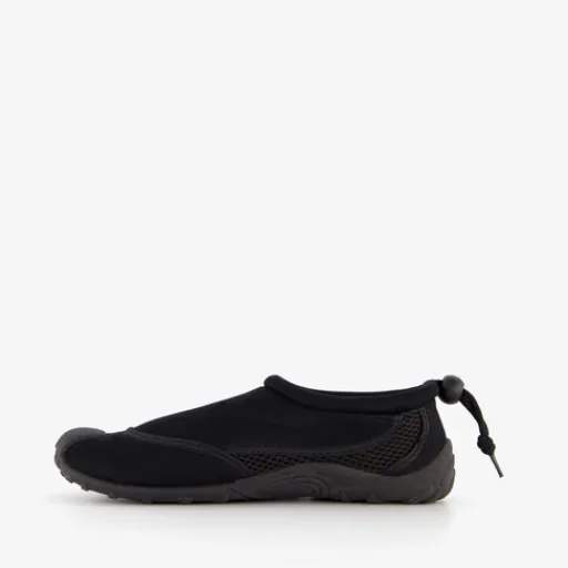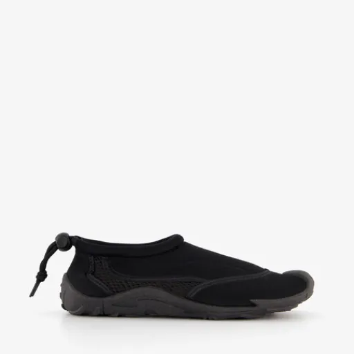 Zwarte water/surfschoenen voor dames. Gemaakt van scuba (textiel), een binnenwerk van textiel en een dikke profielzool van rubber. De waterschoenen hebben een elastische instap met aansnoerkoordje aan de achterzijde voor een optimale pasvorm. Hierdoor zitten de schoenen stevig om de voeten. Vervaardigd van ademend materiaal. De waterschoenen zijn te gebruiken tijdens het zwemmen, surfen of andere water gerelateerde sporten en beschermen de voeten optimaal.