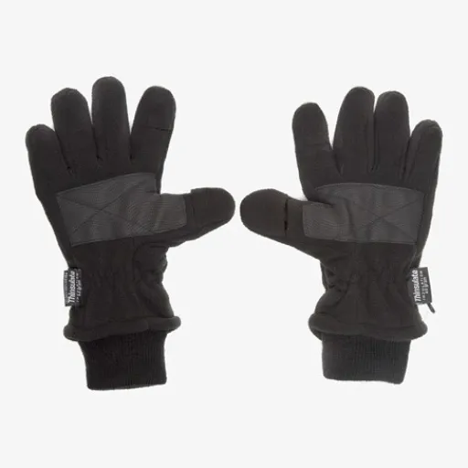 Zwarte fleece handschoenen voor heren en dames. Voorzien van een aansluitende pasvorm en een extra verlenging boven de pols die ervoor zorgt dat de handschoenen goed in de mouw van een jas zijn weg te werken. De handschoenen hebben een zachte, warme Thinsulate voering die ademend, warmte-isolerend en vochtwerend is. Het ruwe materiaal in de handpalmen geven extra versteviging en grip. De handschoenen hebben een handig haakje om ze bij elkaar te bewaren en zijn gemaakt van 100% polyester.