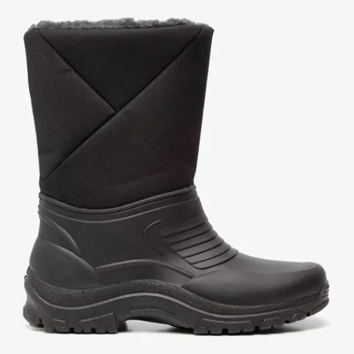 Zwarte, gevoerde snowboots voor heren. Gemaakt van synthetisch leer en nylon, een binnenwerk van textiel en een stevige profielzool. De snowboots hebben een elastische instap en comfortabel voetbed. Voorzien van een warme teddyvoering. De snowboots hebben een grove profielzool van rubber voor een goede grip en demping.