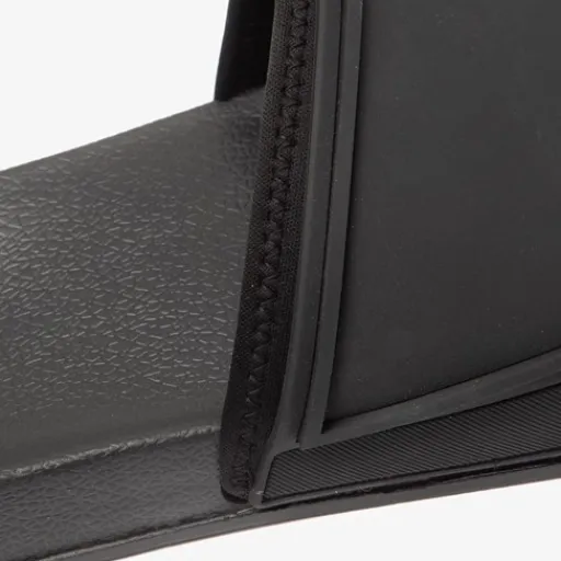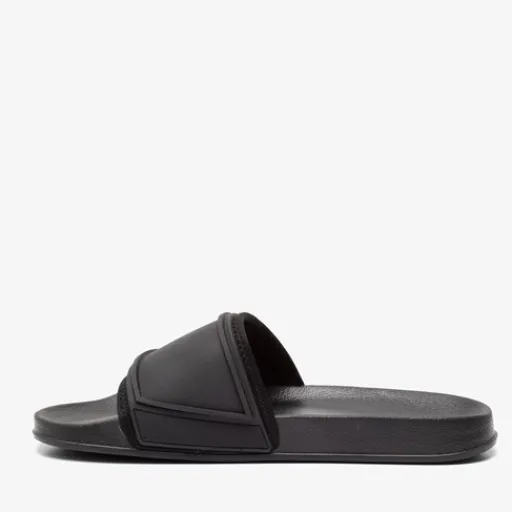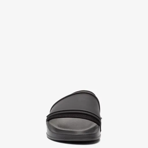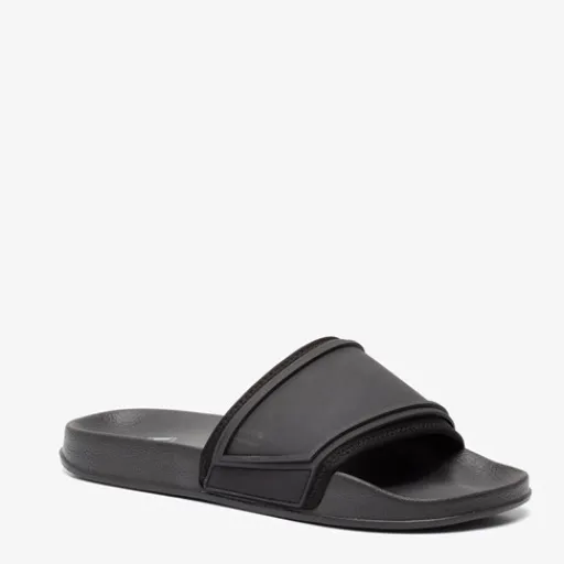 Zwarte badslippers voor heren. Voorzien van een comfortabel voetbed en een stevige band bij de tenen. Deze is aan de binnenkant voorzien van zacht textiel.