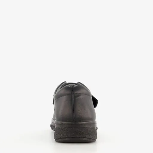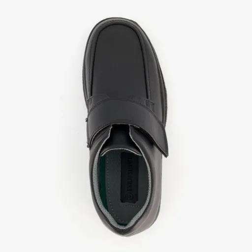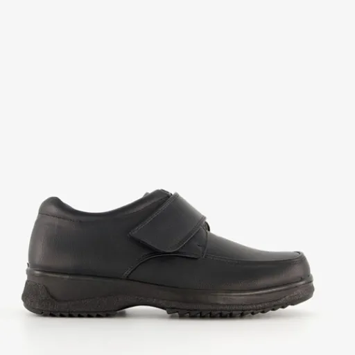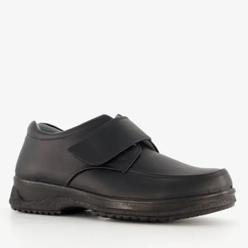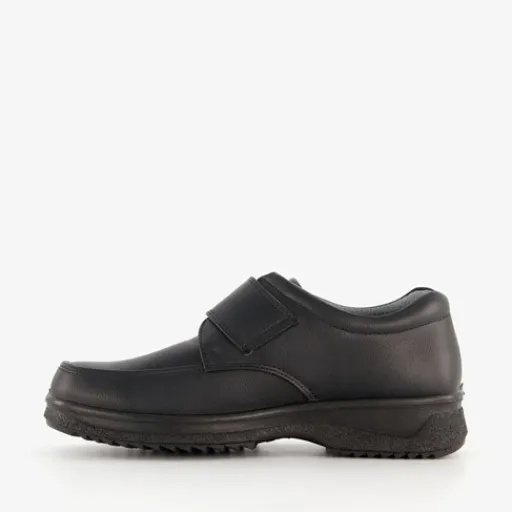Zwarte instappers voor heren. Gemaakt van imitatieleer met een binnenwerk van textiel en een stevige profielzool van rubber. Voorzien van een klittenbandsluiting en een vast voetbed van synthetisch materiaal. De schoenen hebben een extra brede pasvorm.