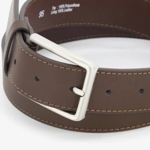 Bruine riem voor heren. Voorzien van een zilveren gesp. De riem is 35 milimeter hoog. Gemaakt van imitatieleer en verkrijgbaar in verschillende maten!