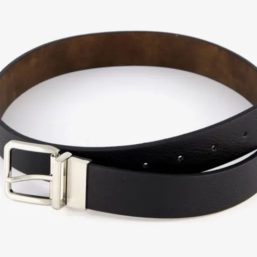 Zwarte heren riem. Gemaakt van imitatieleer en voorzien van een zilveren gesp. De riem is verkrijgbaar in verschillende maten.