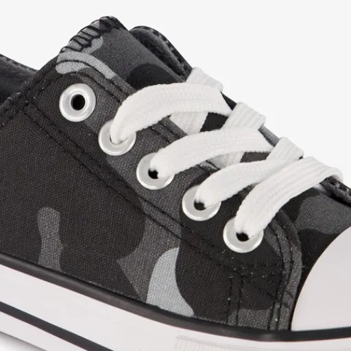 Zwarte canvas gympen met camouflage print voor jongens. Gemaakt van textiel met een stevige profielzool van rubber. Voorzien van een vetersluiting en een comfortabele binnenzool van textiel. Deze is niet uitneembaar.