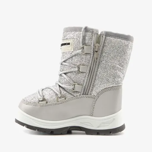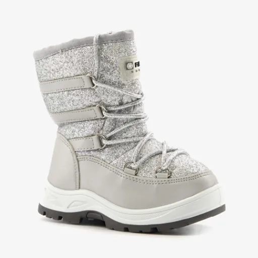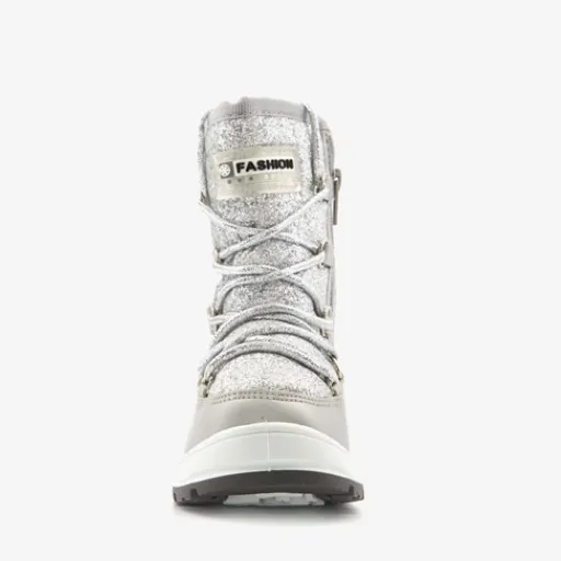 Zilveren snowboots voor kids uit de Scapino collectie. Gemaakt van imitatieleer en kunststof, een binnenwerk van textiel en een stevige profielzool. De snowboots hebben een ritssluiting aan de binnenzijde voor een makkelijke instap. De aansnoerkoordjes aan de voorzijde zorgen voor een aansluitende pasvorm en houden kou en wind buiten. Voorzien van een zachte binnenvoering en een glitter dessin op het bovenwerk. De snowboots hebben een dikke buitenzool van rubber die grip en demping biedt.