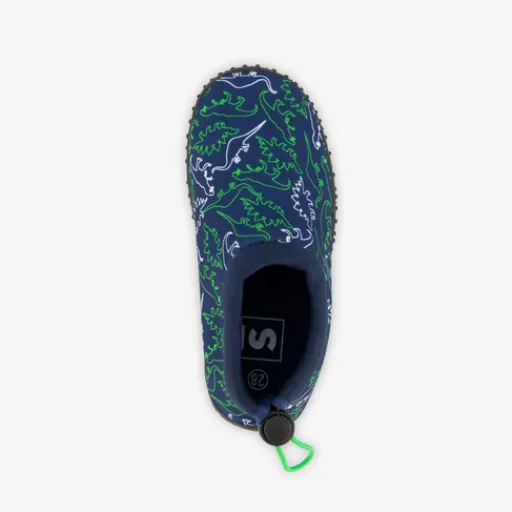 Blauwe surf/waterschoenen voor kids met dino print. Gemaakt van scuba (textiel), een binnenwerk van textiel en een dikke profielzool van rubber. De waterschoenen hebben een elastische instap met aansnoerkoordje aan de achterzijde voor een optimale pasvorm. Hierdoor zitten de schoenen stevig om de voeten. Vervaardigd van ademend materiaal. De waterschoenen zijn te gebruiken tijdens het zwemmen, surfen of andere water gerelateerde sporten en beschermen de voeten optimaal. De binnenzool is uitneembaar zodat je de waterschoenen makkelijk kunt laten drogen.