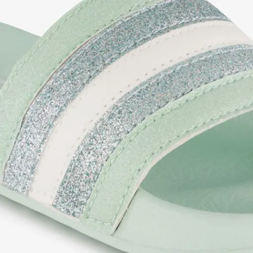 Mintgroene badslippers voor meisjes. Gemaakt van imitatieleer en met een stevige profielzool. De slippers hebben een brede band met glitters bij de tenen.