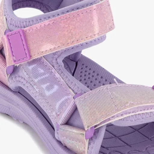 Paarse sandalen voor meisjes. Gemaakt van textiel en imitatieleer. De sandalen zijn voorzien van een roze klittenbandsluiting op de wreef en bij de tenen voor een goede pasvorm. De stevige profielzool biedt grip en demping.