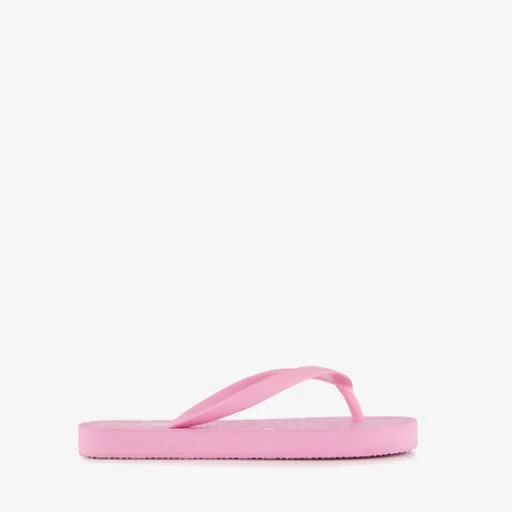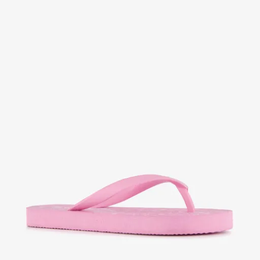 Roze teenslippers voor meisjes. Voorzien van een stevig teenbandje en een comfortabel voetbed met opdrukken van smileys en hartjes. De teenslippers zijn gemaakt van lichtgewicht en sneldrogend materiaal.