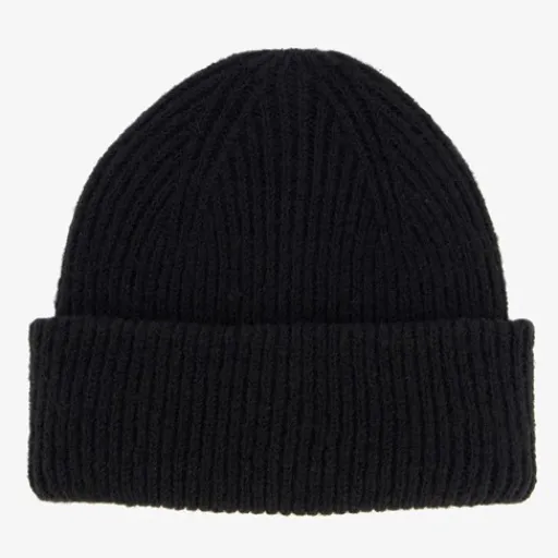 Ribgebreide muts voor dames. De zwarte muts heeft een omslag en is gemaakt van 62% polyester, 34% acryl en 4% elastaan.ΒΆ