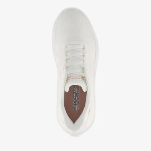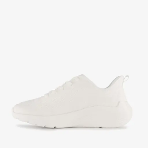 Witte Skechers Bobs Squad Waves – Still Wading sneakers voor dames. Het bovenwerk is gemaakt van mesh, het binnenwerk van textiel en de flexibele profielzool is van rubber. Voorzien van een vetersluiting en hiellusjes voor een makkelijke instap. Het vaste voetbed bevat Memory Foam wat voor demping en extra comfort zorgt. De sneakers hebben een schokabsorberende middenzool en kunnen gewassen worden in de wasmachine.