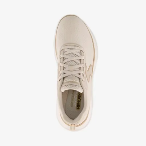 Beige Skechers Flex Appeal 5.0 dames sneakers. Gemaakt van textiel, een binnenwerk van textiel en een flexibele zool. De sneakers hebben een vetersluiting en hiellusje. Voorzien van een Air-Cooled memory foam voetbed wat naast optimale demping een goede vocht- en warmte afvoer biedt en de voeten zo langer droog en fris houdt. De gewatteerde hielkap zorgt voor extra zachtheid om de hiel tijdens het lopen. De sneakers hebben een Flex-Lite loopzool. Deze zool volgt de bewegingen van de voet en geeft uitstekende schokabsorptie bij ieder stap. Op het bovenwerk zijn subtiele glitters aangebracht.