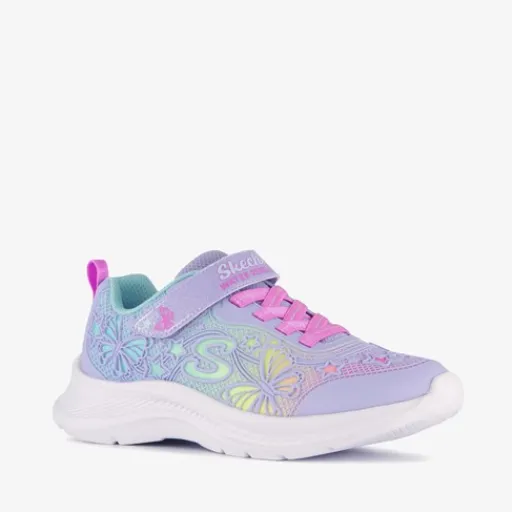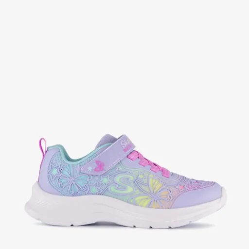 Lila Skechers Girls Jumpsters 2.0 meisjes sneakers. Gemaakt van imitatieleer en textiel, een binnenwerk van textiel en een rubberen zool. De sneakers hebben elastische veters met klittenbandsluiting voor een makkelijke instap en optimale pasvorm. Het vaste voetbed is gemaakt van textiel. De sneakers hebben een waterafstotend bovenwerk, die versierd is met sterretjes en vlinders.