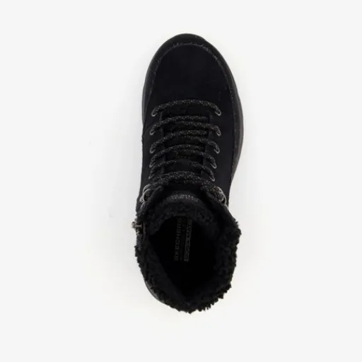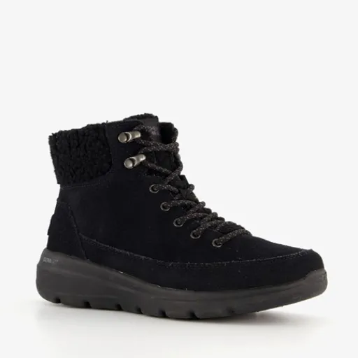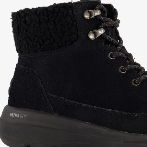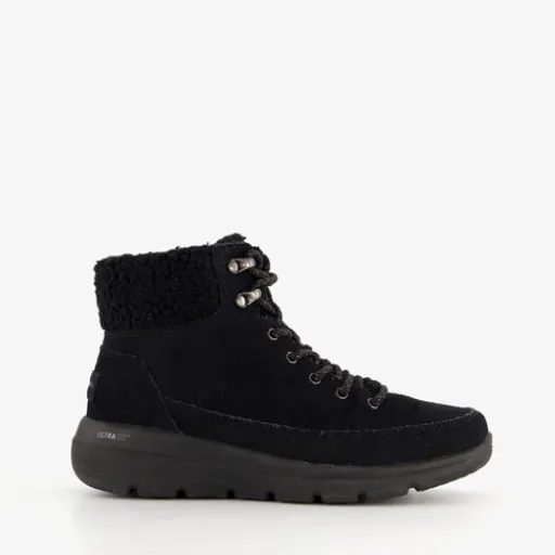Zwarte Skechers On-the-GO Glacial Ultra boots voor dames. Het buitenwerk is gemaakt van suède, het binnenwerk van textiel en de flexibele profielzool van rubber. Voorzien van een veter- en rissluiting voor een goede pasvorm. De ademende binnenzool bevat Air-Cooled Goga Mat™ wat demping en comfort biedt. Het buitenwerk is behandeld met 3M® Scotchgard®. Dit maakt de laarsjes bestendig tegen water. Deze lichte boots zijn voor een deel gevoerd met imitatiebont en hebben een schachthoogte van circa 10 cm.