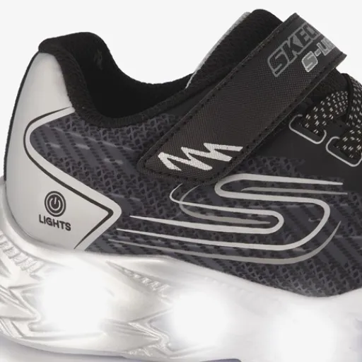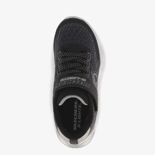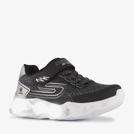 Zwarte Skechers S-Lights Vortex 2.0 – Quantroid sneakers voor jongens. Gemaakt van imitatieleer en textiel, een binnenwerk van textiel en een rubberen zool met lichtjes. De sneakers hebben elastische veters met klittenbandsluiting voor een makkelijke instap. Het vaste voetbed is gemaakt van textiel en is schokdempend. De sneakers van Skechers hebben lichtjes in de zool. Deze zijn niet oplaadbaar.