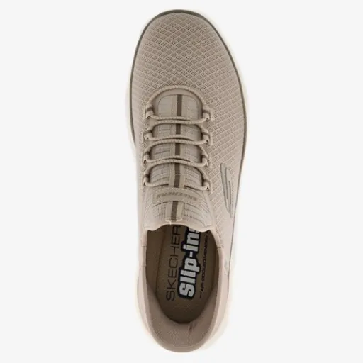Stap handsfree en moeiteloos in en uit deze beige Skechers Slip-ins sneakers voor heren. Het buiten- en binnenwerk van de schoenen zijn gemaakt van textiel en de stevige zool met profiel is van rubber. Voorzien van elastische veters en een aantreklusjes op de tong. De sneakers hebben een uitneembare binnenzool zodat je eventueel jouw eigen zolen in de schoenen kan dragen. Deze bevat Air Cooled Memory Foam wat demping en comfort biedt.