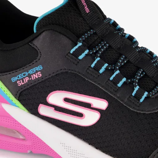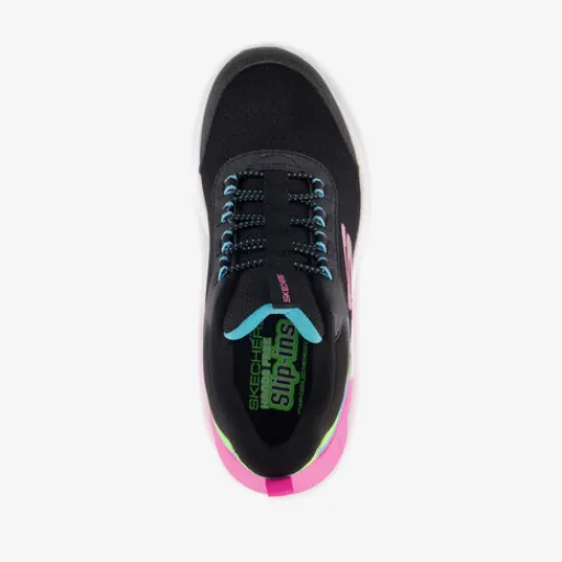 Stap moeiteloos en handsfree in deze zwart-roze Skechers Slip-ins: Microspec Max sneakers voor meisjes. Het buitenwerk is gemaakt van mesh en imitatieleer, het binnenwerk is van textiel en de stevige profielzool is van rubber. Voorzien van elastische veters en aantreklusjes op de tong en hak. De sneakers hebben luchtcompartimenten in de zolen en comfortabele binnenzool van textiel. Deze is uitneembaar.