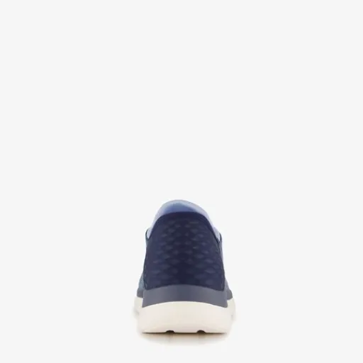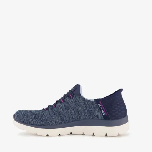Stap handsfree in en uit met deze Blauwe Skechers Slip-Ins Summits Dazzle Navy sneakers voor dames. Gemaakt van textiel, een binnenwerk van textiel en een flexibele loopzool van rubber. De sneakers hebben elastische veters en een comfortabel voetbed met memory foam. Deze is uitneembaar.
