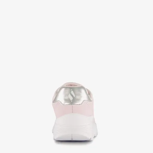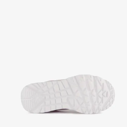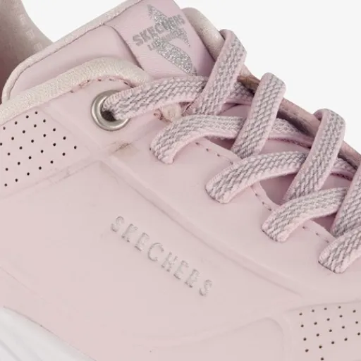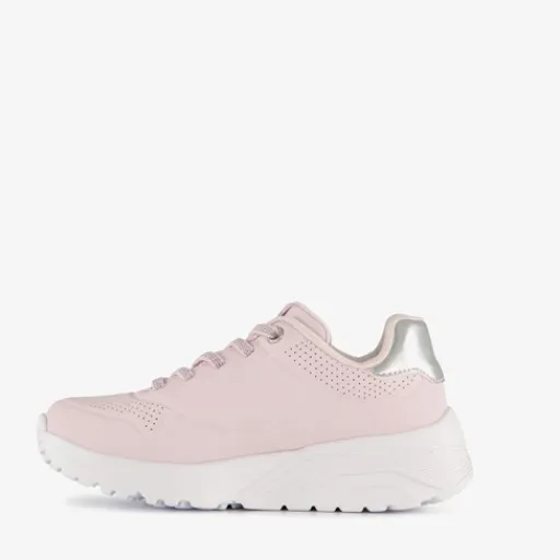 Roze Skechers Uno Lite sneakers voor meisjes. Het buitenwerk is gemaakt van imitatieleer, het binnenwerk van textiel en de stevige zool met profiel. Voorzien van een vetersluiting en een vaste binnenzool. Deze bevat memory Foam wat voor demping en extra comfort zorgt. De sneakers hebben een goudkleurige inzet bij de hak en een dikke, witte buitenzool.