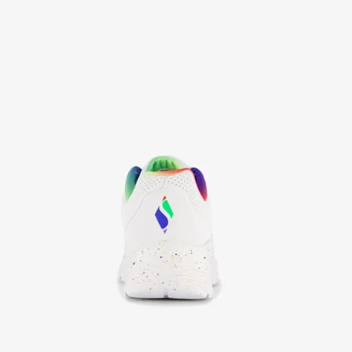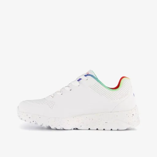 Witte Skechers Uno Lite Rainbow Specks sneakers voor meisjes. Het buitenwerk is gemaakt van geperforeerd imitatieleer, het binnenwerk van textiel en de stevige profielzool van rubber. Voorzien van een vetersluiting voor een goede pasvorm en een uitneembare binnenzool. Deze bevat Air-Cooled Memory Foam wat voor demping en comfort zorgt. De buitenzool is bij de hak circa 5 cm hoog en wordt versierd met gekleurde verfspetters.