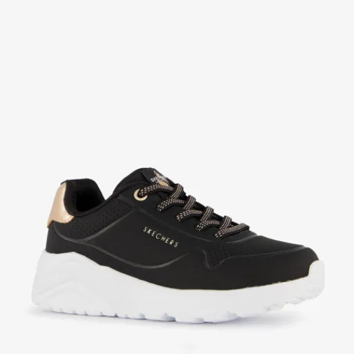 Zwarte Skechers Uno Lite sneakers voor meisjes. Het buitenwerk is gemaakt van imitatieleer, het binnenwerk van textiel en de stevige zool met profiel van rubber. Voorzien van een vetersluiting voor een fijne pasvorm en een uitneembare binnenzool. Deze bevat Memory Foam wat demping en comfort biedt. De sneakers hebben dikke, witte buitenzolen en worden versierd met goudkleurige details.
