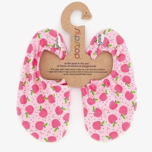 Roze slipstop kinder schoenen met opdrukken van appeltjes. Het ademende buitenwerk van de schoenen is gemaakt van 87% polyester en 13% elastaan. De zool bestaat uit 84% PVC, 8% katoen en 8% elastaan. Slipstop schoenen houden de voeten van je kind schoon en droog. De schoentjes zijn licht, elastisch, flexibel, waterafstotend en hebben een profielzool. Ze kunnen zowel binnen als buiten gedragen worden. Dit maakt ze ideaal voor bij het zwembad en op het strand, maar ook heel handig om mee te geven naar de kinderopvang of mee te nemen naar de camping. Slipstop schoenen zijn daarnaast ook erg geschikt voor oudere kinderen en zelfs volwassenen. Ze kunnen gedragen worden tijdens het beoefenen van verschillende sporten en activiteiten.