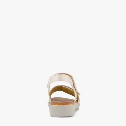 Beige sandalen met goudkleurige accenten van Softline voor dames. Gemaakt van imitatieleer met een stevige profielzool van rubber. De sandalen hebben een brede band bij de tenen met klittenbandsluiting en een band met klittenband bij de enkel. Het comfortabele voetbed van imitatieleer is niet uitneembaar.