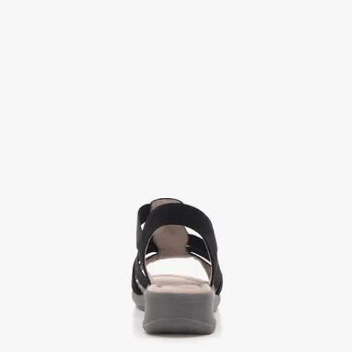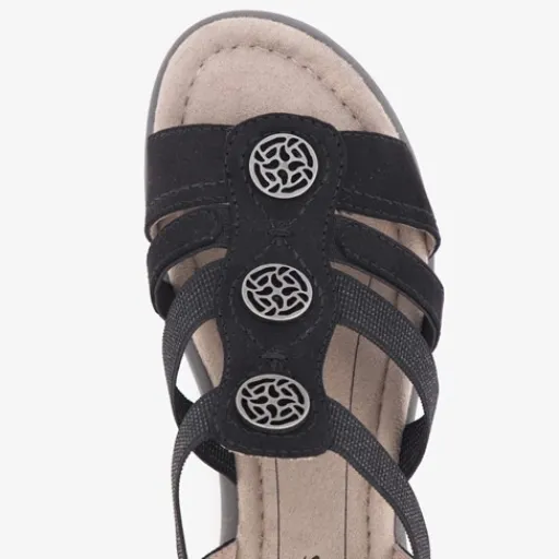 Zwarte Softline sandalen voor dames. Gemaakt van textiel met een stevige zool van rubber. Voorzien een wreefbandje met drie zilverkleurige knopen en bandjes om de tenen en de hiel. Het vaste voetbed is gemaakt van textiel. Deze mooie sandalen hebben een brede pasvorm.
