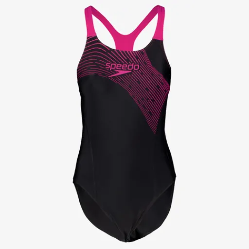Zwarte Speedo Medley Logo badpak voor dames. Voorzien van een muscleback die zorgt voor bewegingsvrijheid en flexibiliteit. Gemaakt van 100% polyester en vervaardigd van Endurance10-stof wat beter bestand is tegen inwerking van chloor dan onbeschermd elastaan. De stof bevat Creora HighClo waardoor het badpak langer als nieuw blijft en niet lubbert. Voorzien van een roze details en een merkopdruk aan de voorzijde.