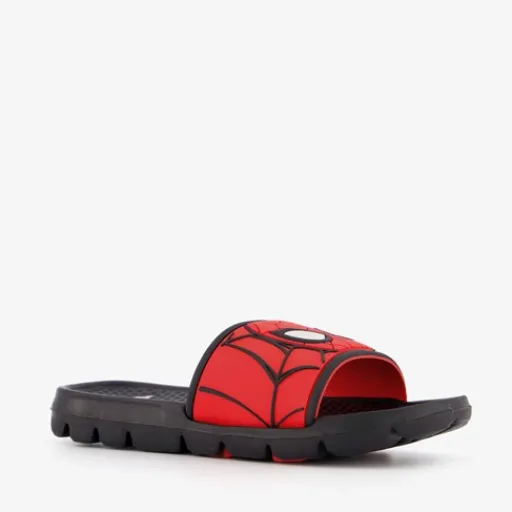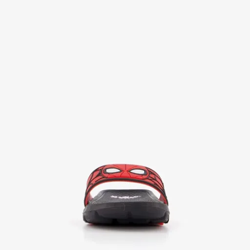 Zwarte Spider-Man badslippers voor jongens. Gemaakt van imitatieleer met een stevige profielzool van rubber. De slippers hebben een brede, comfortabele voetband met een stoere opdruk van de Spider-Man.