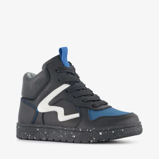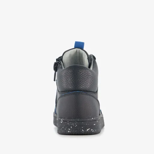 Zwarte, hoge sneakers voor jongens van Stap. Het buiten- en binnenwerk zijn van leer gemaakt en de stevige zool met profiel is van rubber. De binnenzool is van leer en is niet uitneembaar. Voorzien van een vetersluiting en een ritssluiting aan de binnenzijde voor een optimale pasvorm en een aantreklusje op de tong voor een makkelijke instap. De sneakers hebben blauwe en witte accenten op het bovenwerk en op de zool zijn witte spetters aangebracht. Deze schoenen met het Stap-keurmerk voldoen aan de volgende kwaliteitseisen: ademend leer, een buigzame zool voor een goede voetafwikkeling, een leren voetbed, een perfecte pasvorm en een verstevigde hiel voor stabiliteit en een gezonde loophouding. De schoenen zijn goedgekeurd door orthopedisch chirurg Dr. Visser.