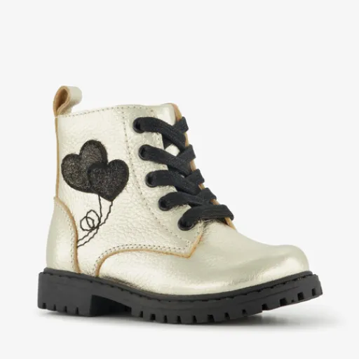 Goudkleurige veterboots met hartjes voor meisjes van Stap. Het buiten- en binnenwerk zijn van leer gemaakt en de stevige buitenzool met een lage hak is van rubber. Voorzien van een veter- en ritssluiting voor een optimale pasvorm en een aantreklusje aan de achterzijde voor een makkelijke instap. De boots hebben een comfortabele, vaste binnenzool van leer. Schachthoogte is 8 cm. Deze schoenen met het Stap-keurmerk voldoen aan de volgende kwaliteitseisen: ademend leer, een buigzame zool voor een goede voetafwikkeling, een leren voetbed, een perfecte pasvorm en een verstevigde hiel voor stabiliteit en een gezonde loophouding. De schoenen zijn goedgekeurd door orthopedisch chirurg Dr. Visser.