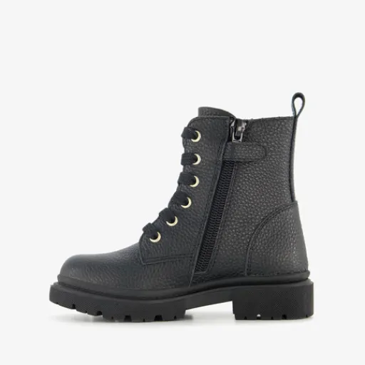 Zwarte veterboots voor meisjes van Stap. Gemaakt van leer, een binnenwerk van leer en een rubberen zool. De boots hebben een rits- en vetersluiting en vast voetbed van leer. Aan de buitenzijde zit een decoratieve strik. Schoenen met het Stap-keurmerk voldoen aan de volgende kwaliteitseisen:-Ademend leer-Buigzame zool voor goede voetafwikkeling-Leren voetbed-Perfecte pasvorm-Verstevigde hiel voor stabiliteit en een gezonde loophoudingDe schoenen zijn goedgekeurd door orthopedisch chirurg Dr. Visser.