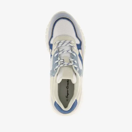 Witte dames dad sneaker van Supercracks met denim details. Het buitenwerk is gemaakt van textiel en imitatieleer, het binnenwerk van textiel en de stevige profielzool van rubber. Voorzien van een vetersluiting, hiellusjes en een comfortabele binnenzool met Soft Foam. Binnenzool is uitneembaar.