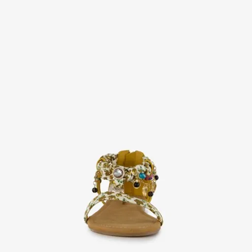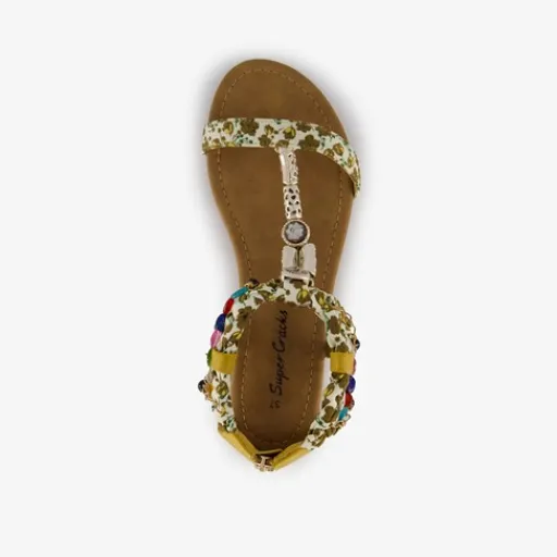 Deze feestelijke, gele sandalen van Supercracks maken elke outfit speciaal! De sandalen worden versierd met een bloemenprint, kettinkjes en kralen. Het bovenwerk is gemaakt van imitatieleer en textiel en de zool van rubber. Ze zijn voorzien van een dichtje hiel met een goudkleurige ritssluiting.