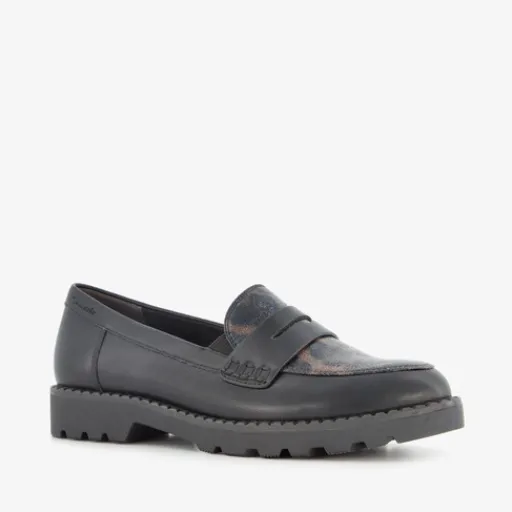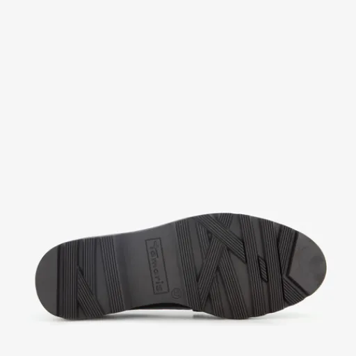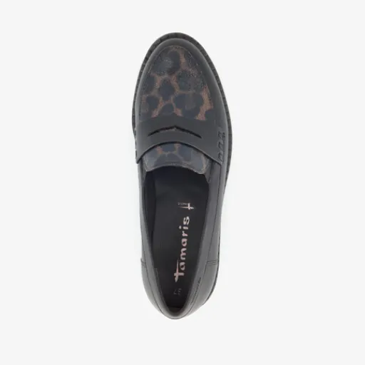 Zwarte loafers voor dames uit de Tamaris collectie. Het buiten- en binnenwerk zijn gemaakt van imitatieleer en de stevige profielzool is van rubber. Voorzien van een elastische instap en een vaste binnenzool van Luxe Foam. Deze biedt demping en comfort. De loafers hebben een laag hakje en op de wreef van de schoenen zijn panterprint details aangebracht.