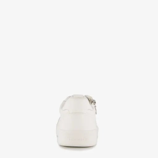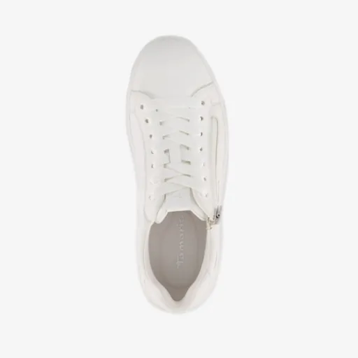 Lage, witte sneakers voor dames van Tamaris. Gemaakt van imitatieleer, een binnenwerk van textiel en een rubberen zool. De sneakers hebben een rits- en vetersluiting en comfortabel soft foam voetbed van textiel. Deze is uitneembaar.