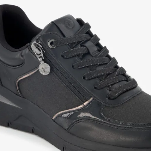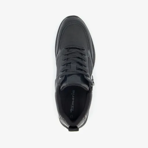 Lage zwarte sneakers voor dames van Tamaris. Gemaakt van imitatieleer met een binnenwerk van textiel en een rubberen profielzool. De sneakers hebben een vetersluiting met rits en hiellusjes voor een gemakkelijke instap. Het uitneembare voetbed bevat Luxe Foam, dat demping en comfort biedt.