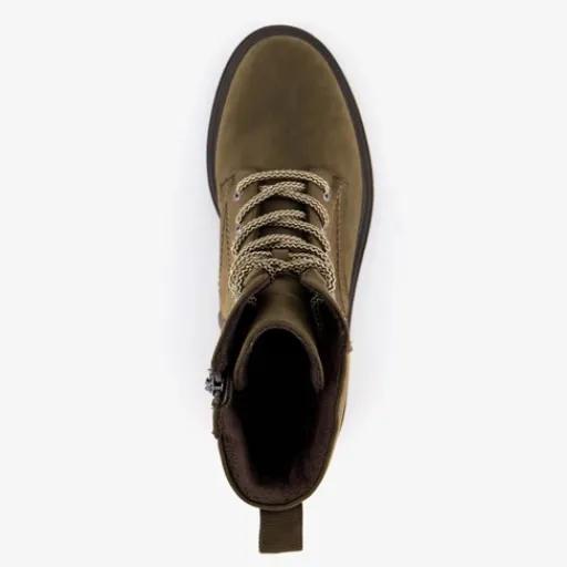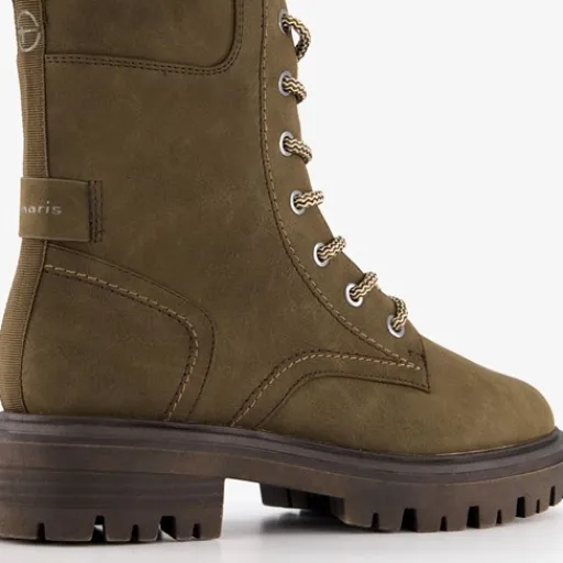 Olijfgroene veterboots voor dames uit de Tamaris collectie. Het buitenwerk is gemaakt van imitatieleer, het binnenwerk van textiel en de stevige zool met profiel van rubber. Voorzien van een veter- en ritssluiting en lusjes aan de achterzijde voor een makkelijke instap. De comfortabele binnenzool van textiel is niet uitneembaar. Hakhoogte is circa 2,5 cm en schachthoogte is 16 cm.