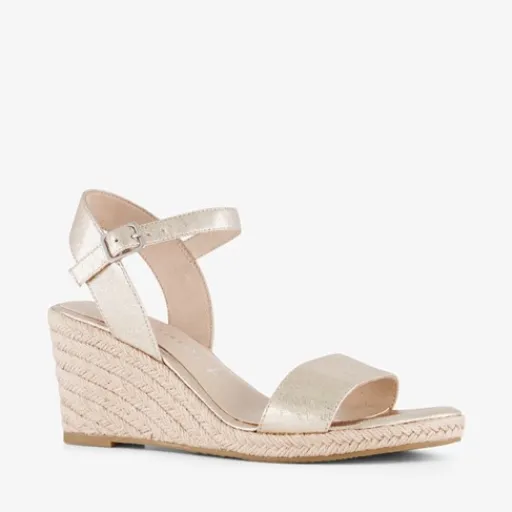 Goudkleurige espadrilles met sleehak van Tamaris. De sandalen zijn gemaakt van textiel en imitatieleer en hebben een gevlochten jute zool. Voorzien van bandjes over de tenen en een enkelbandje met gespsluiting. Deze mooie espadrilles hebben een sleehak van circa 8 cm. Het comfortabele voetbed van imitatieleer en is niet uitneembaar.