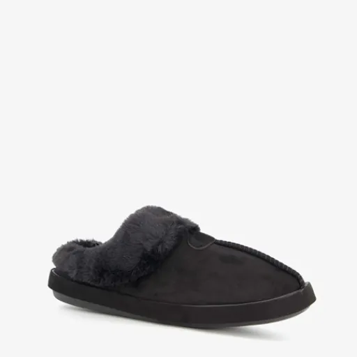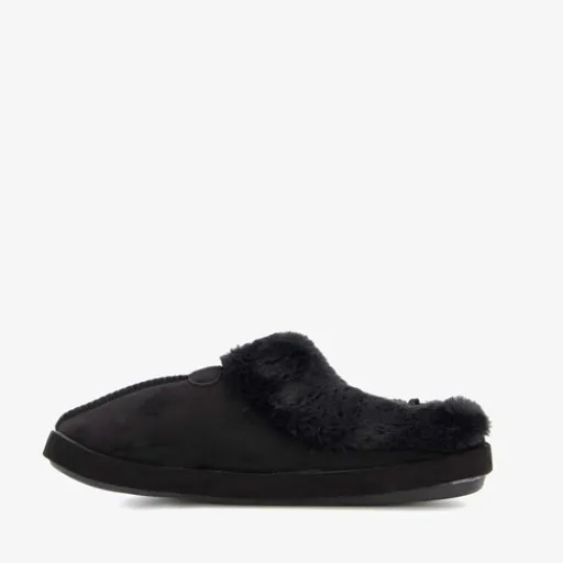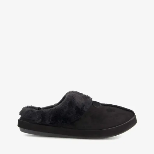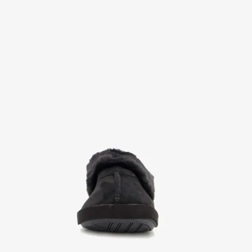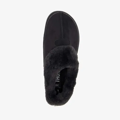 Zwarte pantoffels voor dames van Thu!s. Het binnen- en buitenwerk zijn gemaakt van textiel en de profielzool is van rubber. De pantoffels hebben een comfortabel voetbed en een warme voering.