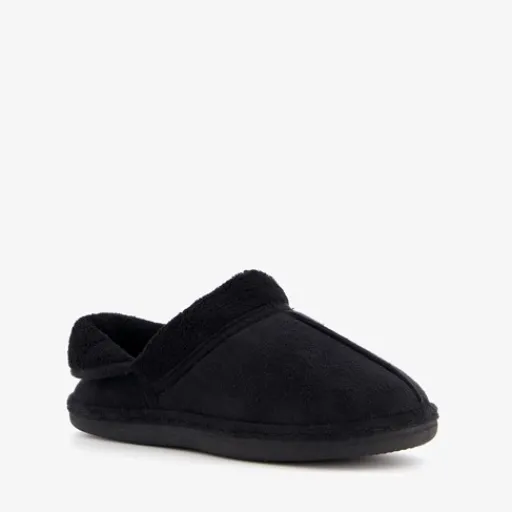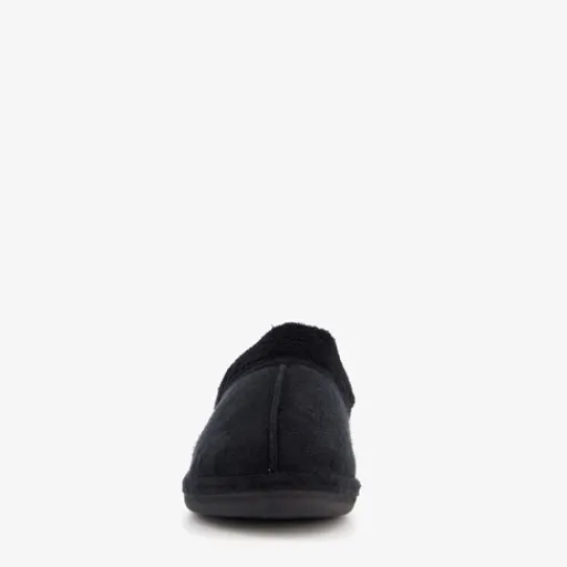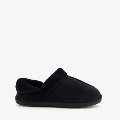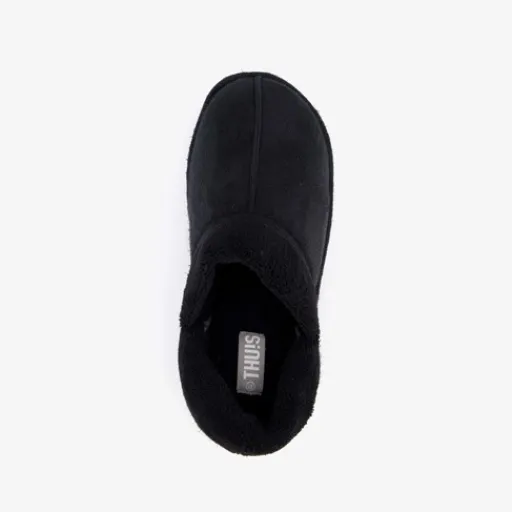 Zwarte, gevoerde pantoffels voor dames van Thu!s. Gemaakt van textiel, een binnenwerk van textiel en een stevige profielzool. De pantoffels hebben een zachte, warme voering en een comfortabel voetbed.