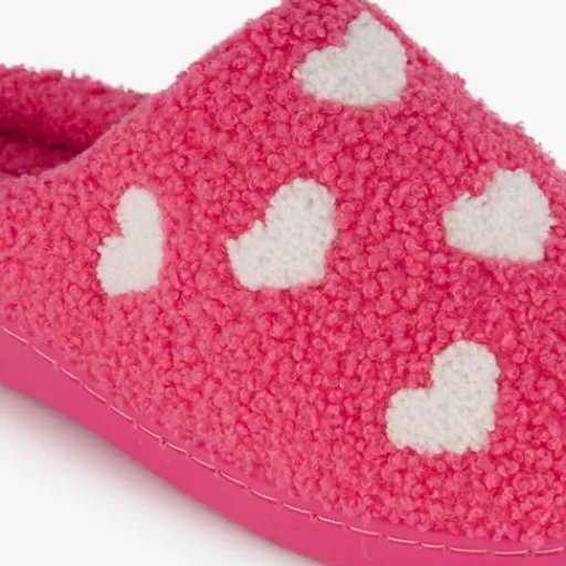 Roze teddy sloffen met witte hartjes voor dames van Thuis. Gemaakt van textiel met een profielzool van rubber. De sloffen hebben een zachte, warme voering.