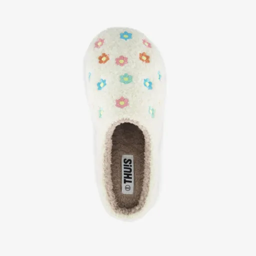 Beige teddy pantoffels voor dames van Thu!s. De pantoffels zijn gemaakt van textiel en hebben een stevige antislipzool van rubber. De pantoffels hebben een zachte voering en op het bovenwerk zijn kleurrijke bloemen aangebracht. Binnenzool is niet uitneembaar.