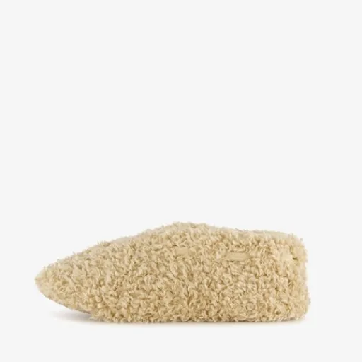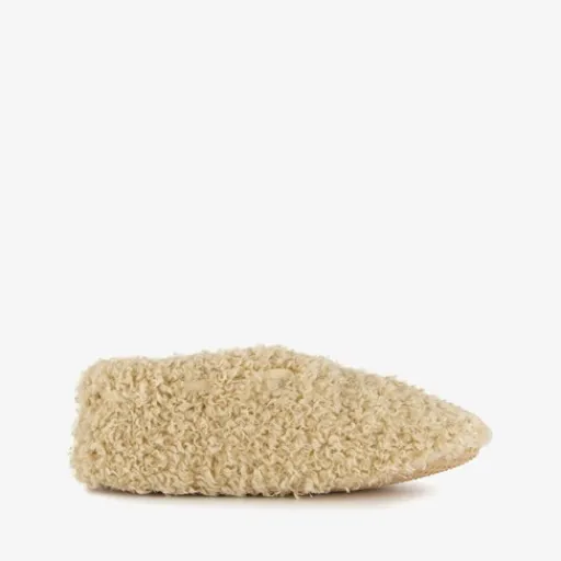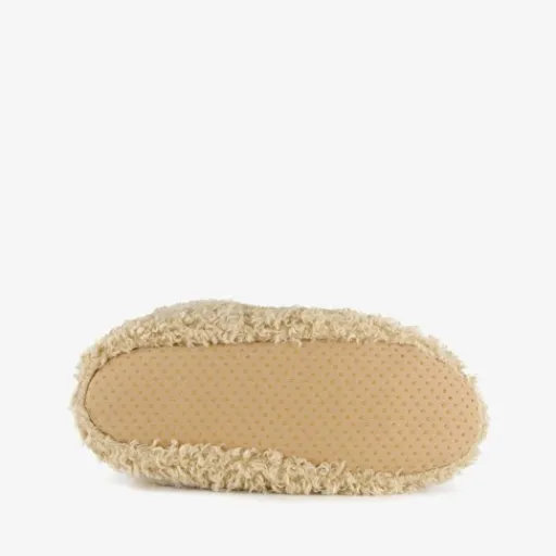 Beige teddy sloffen voor dames van Thu!s. Gemaakt van textiel met een stevige profielzool van rubber. De sloffen hebben een zachte, warme voering.