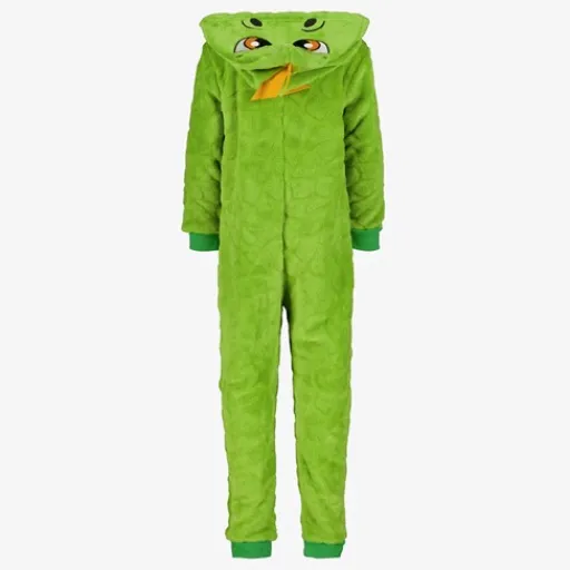 Groene dino onesie voor kids. De onesie is heerlijk zacht en warm en heeft een capuchon met dinokop. Lekker om thuis in te relaxen, te spelen of een feestje in te vieren. De onesie heeft een ritssluiting, elastiek in de boorden en is gemaakt van 100% polyester.