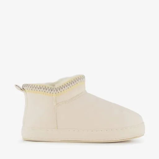 Beige pantoffels voor dames. Gemaakt van imitatiesuede, een warme binnenvoering en een stevige profielzool voor een goede grip en demping.